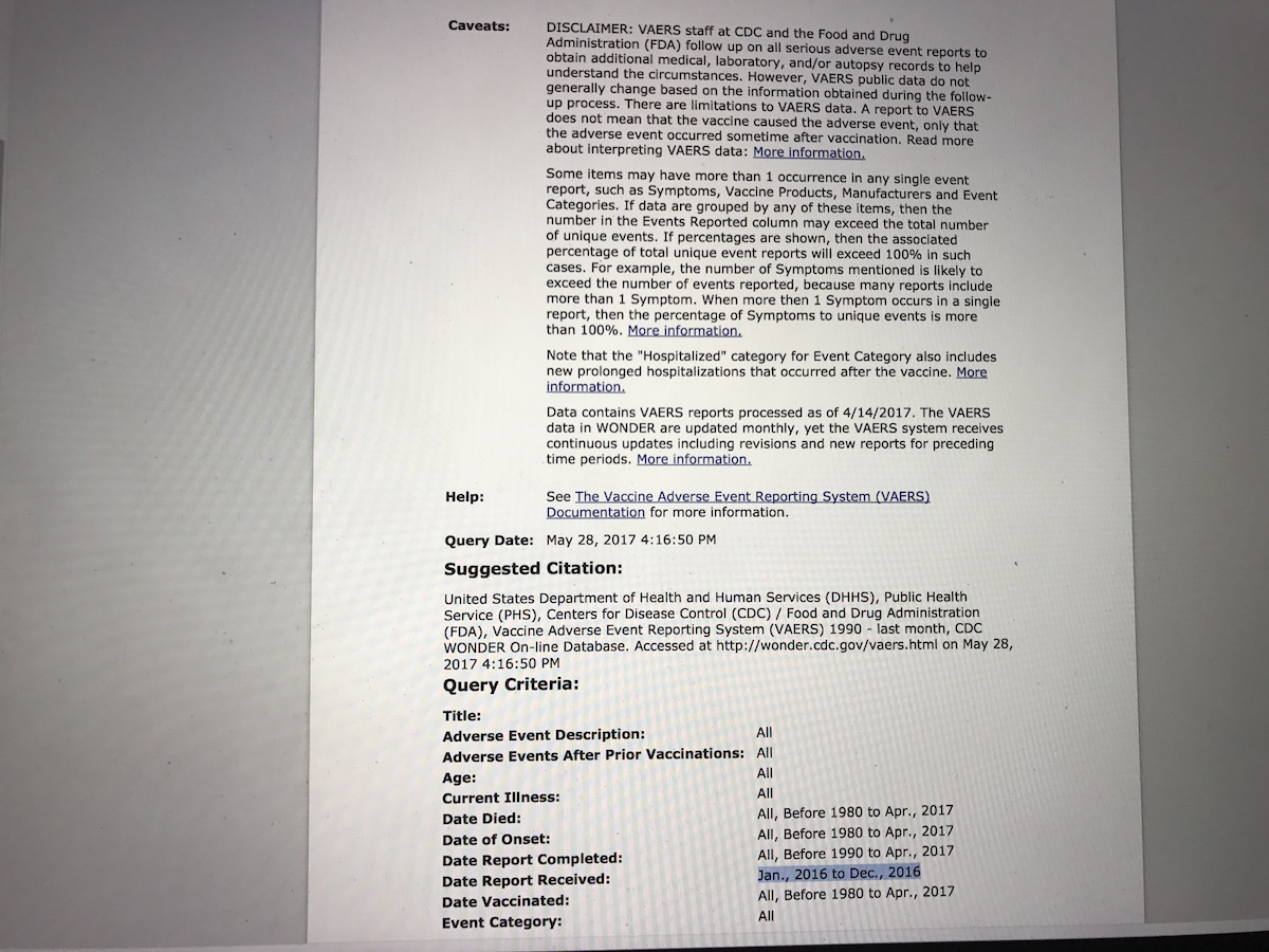 VAERS 2016 Report Results